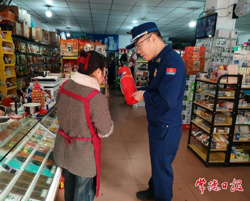 石门县消防救援局对超市灭火器材进行检查。