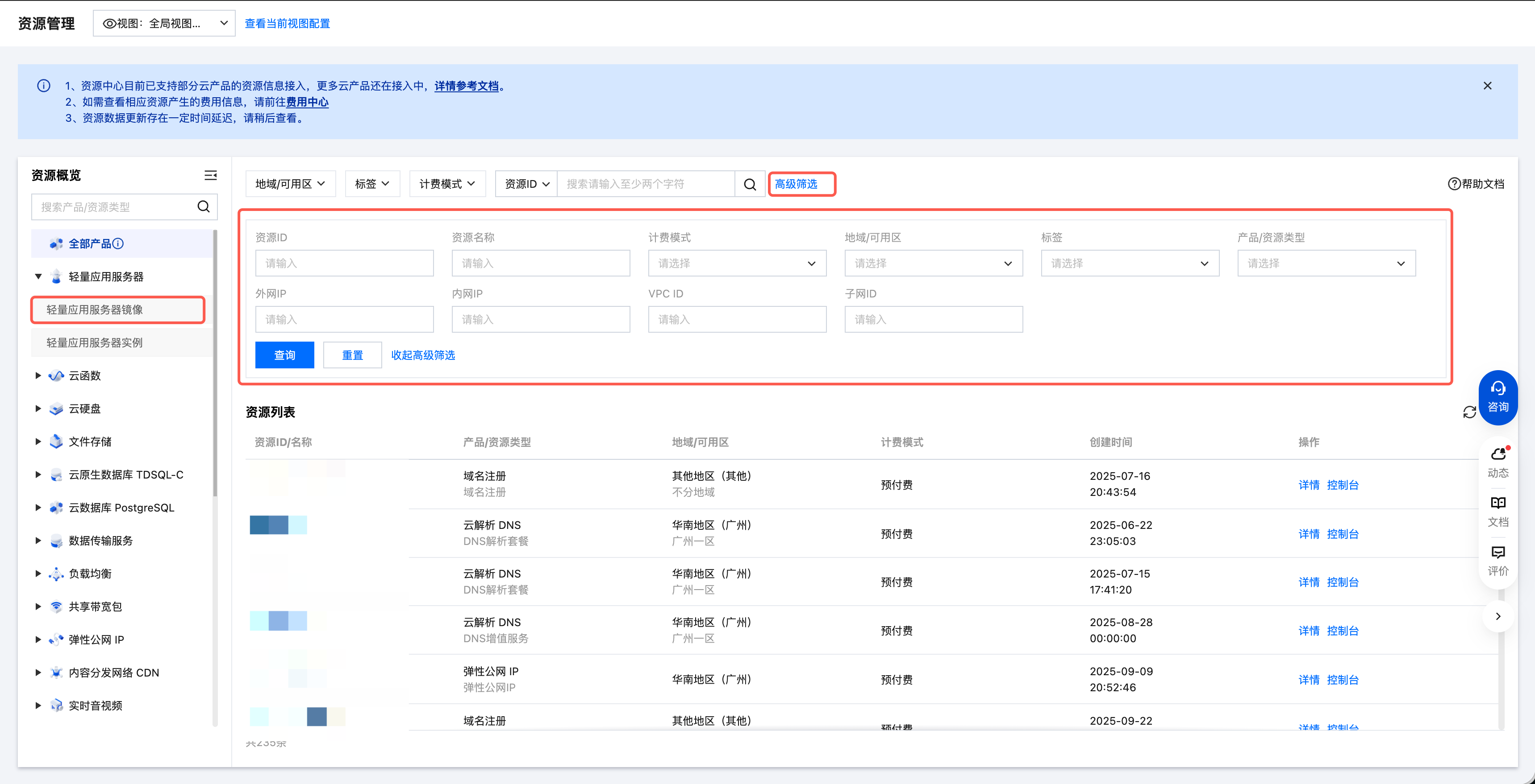 左侧资源概览模块支持快速筛选资源类型,右侧模块支持下拉展开高级筛选进行组合条件筛选。