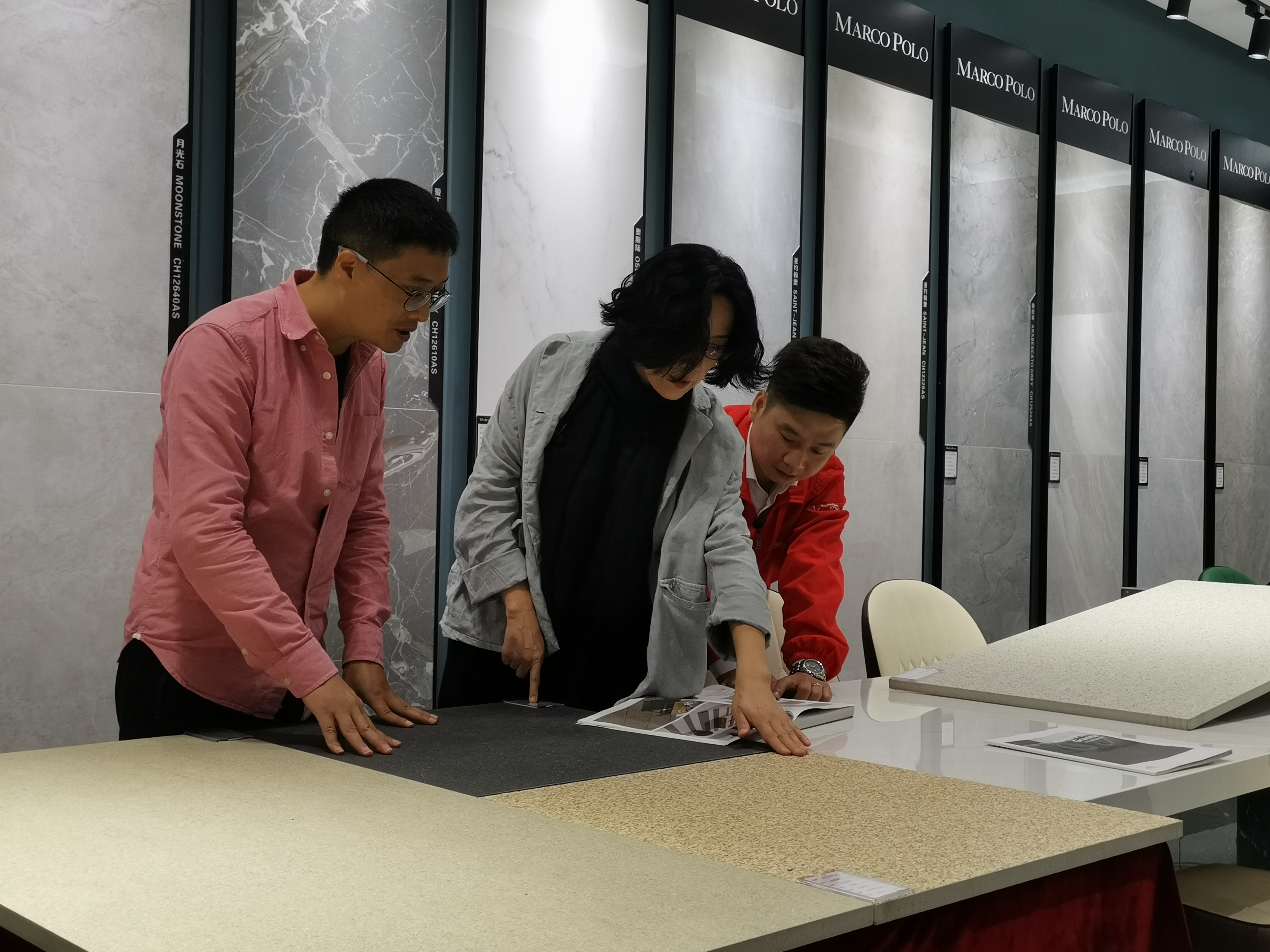 ▲ 设计师何潇宁老师进店体验马可波罗瓷砖卓越品质
