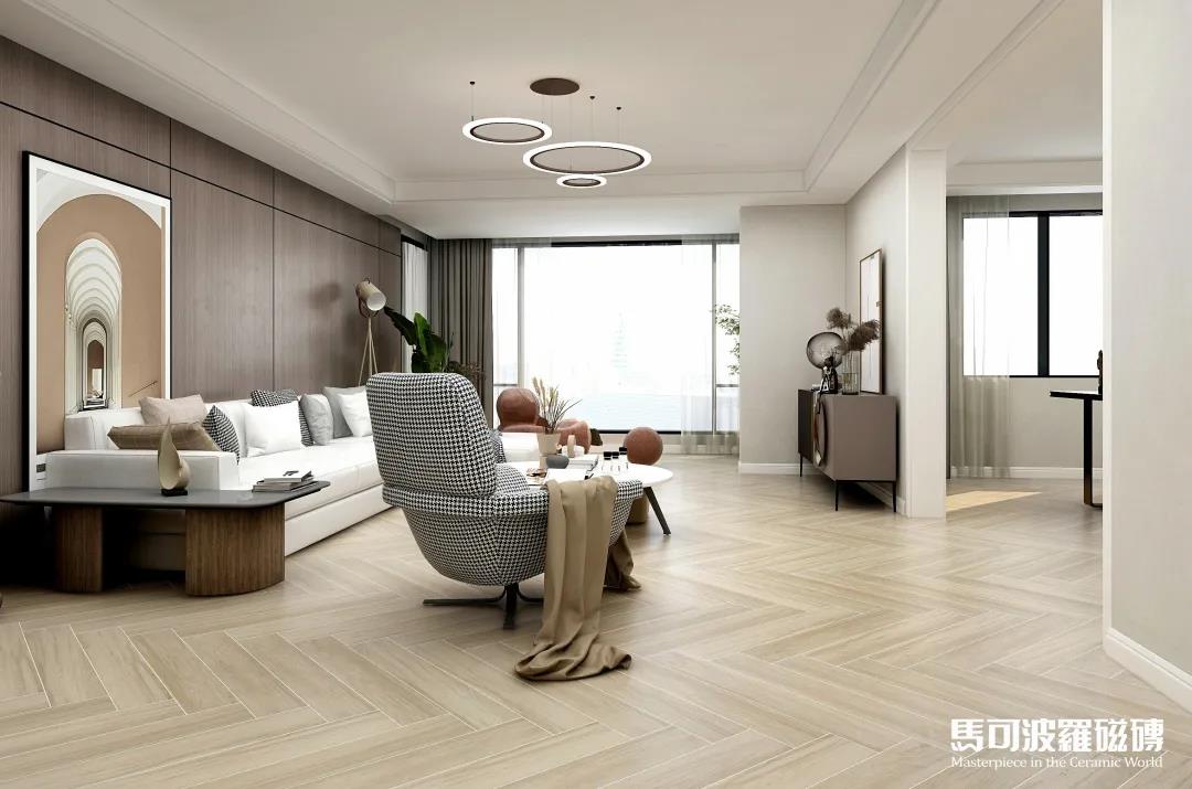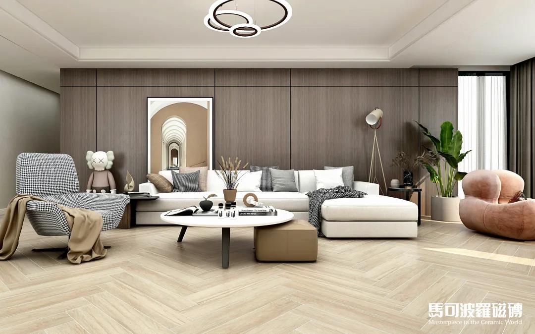 地面的浅杏色木纹砖赛州檀木采用人字形铺贴式,时尚兼具层次感,搭配简约规整的浅色家居布置 樱花视频免费观看,阳光透过落地窗照射进来,一派清新怡然。