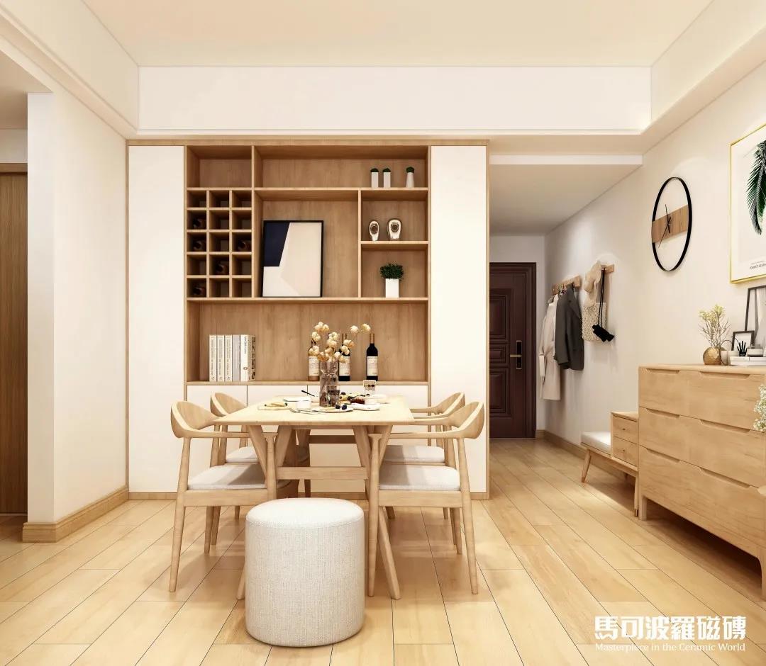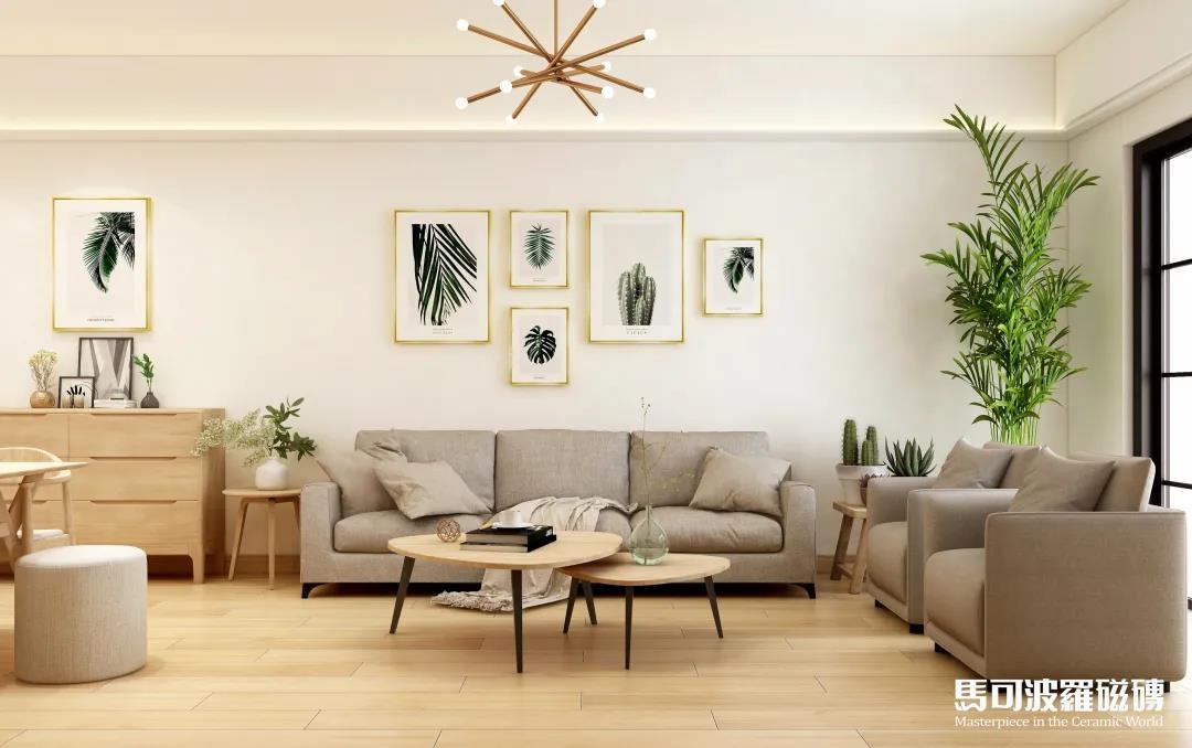 马可波罗木纹砖芬兰赤松,独具北欧风情的柔和色调 樱花视频,搭配木色与浅灰色家装,加之绿植和挂画点缀,清新又不失精致品味。